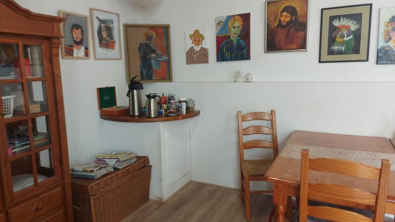 In de gezellige Galerie wordt gewerkt en geëxposeerd. Er is ruimte voor 45 schilderijen en 10 beelden.